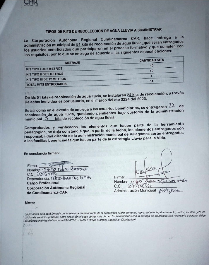 El 17 de noviembre de 2023, se entregan 52 kits del programa "lluvia para la vida", cada kit compuesto por 1 tanque de 1.000 lts.,1 canal y sus respectivos accesorios para instalación.