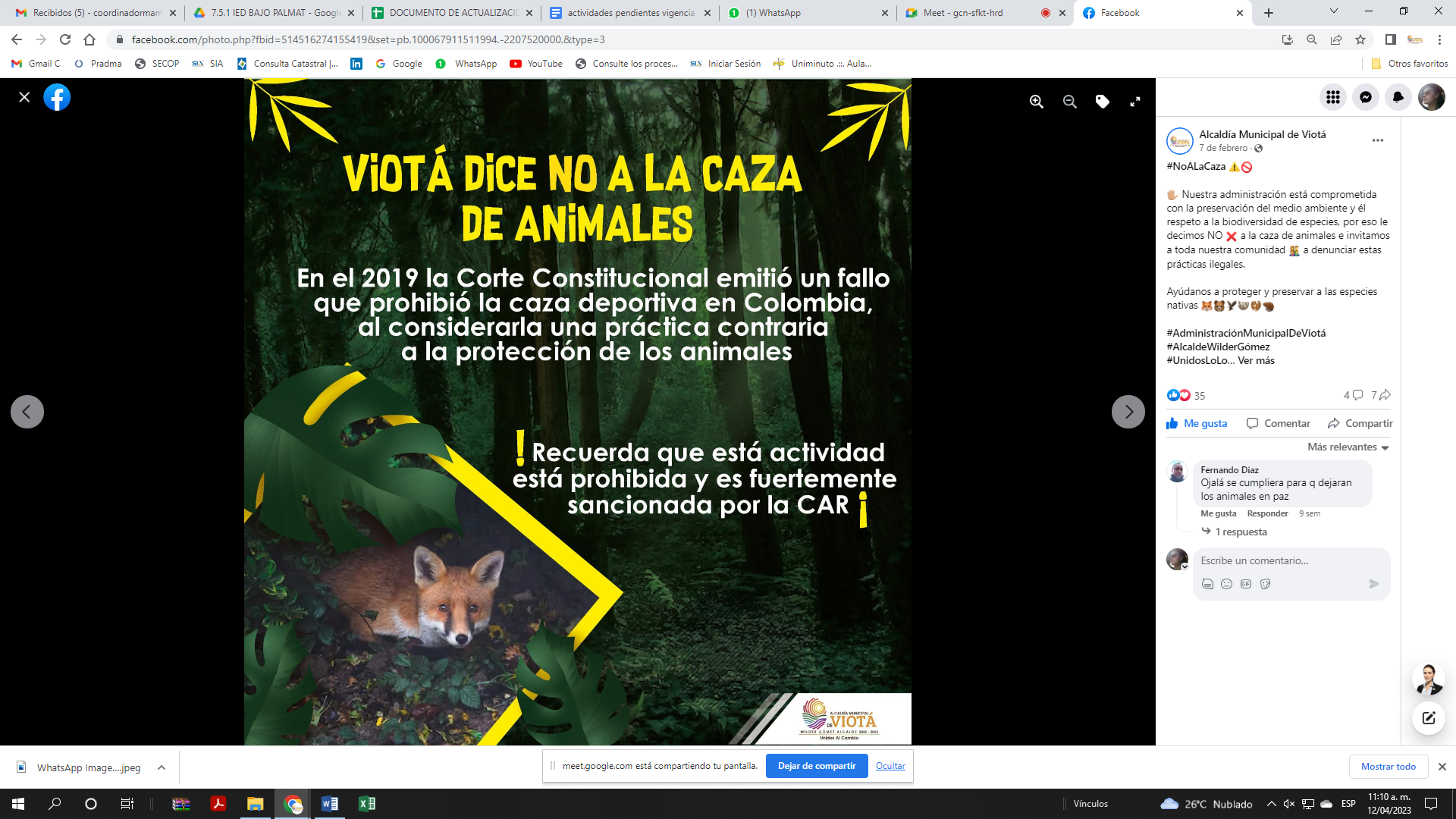 publicaicon de facebook sobre no a la caza de animales